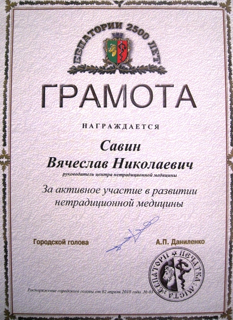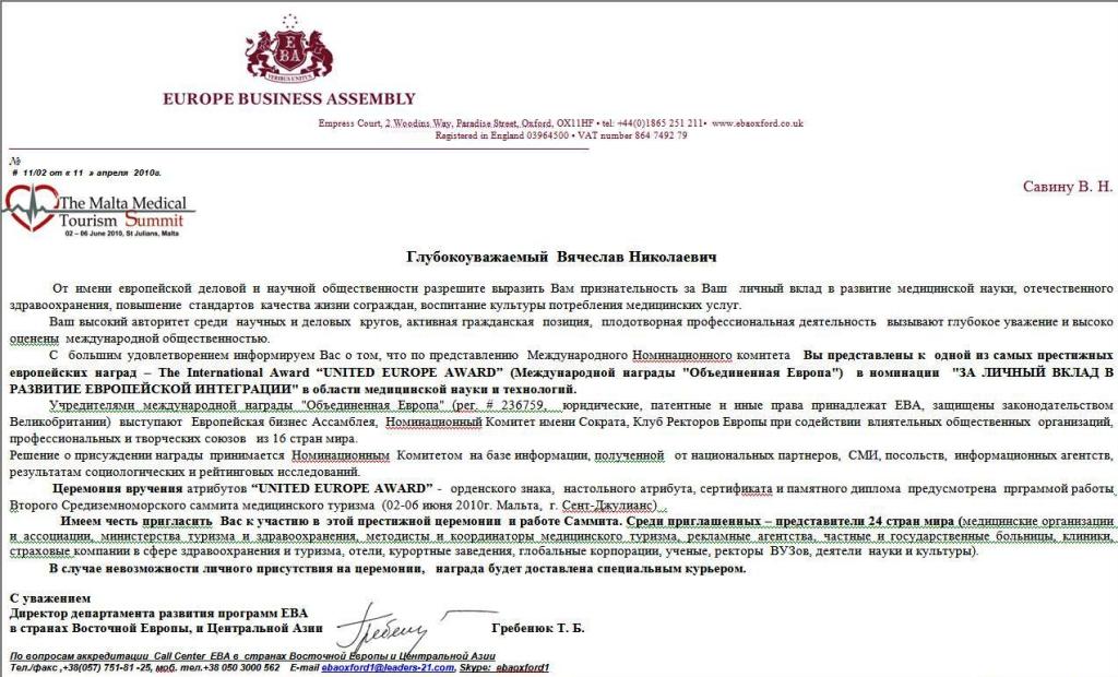 Савин Вячеслав Николаевич обладатель одной из самых престижных Европейских наград в области медицинской науки и технологий The International Award “UNITED EUROPE AWARD”, Великобритания 2010.